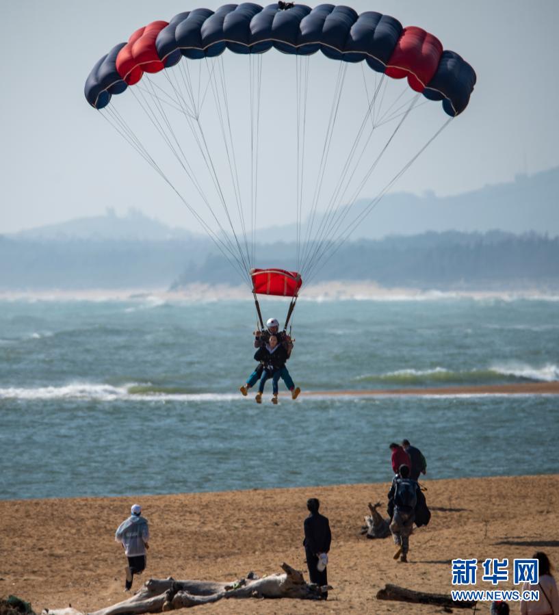 1月2日,在海南博鰲,游客在教練的陪伴下體驗(yàn)跳傘。
