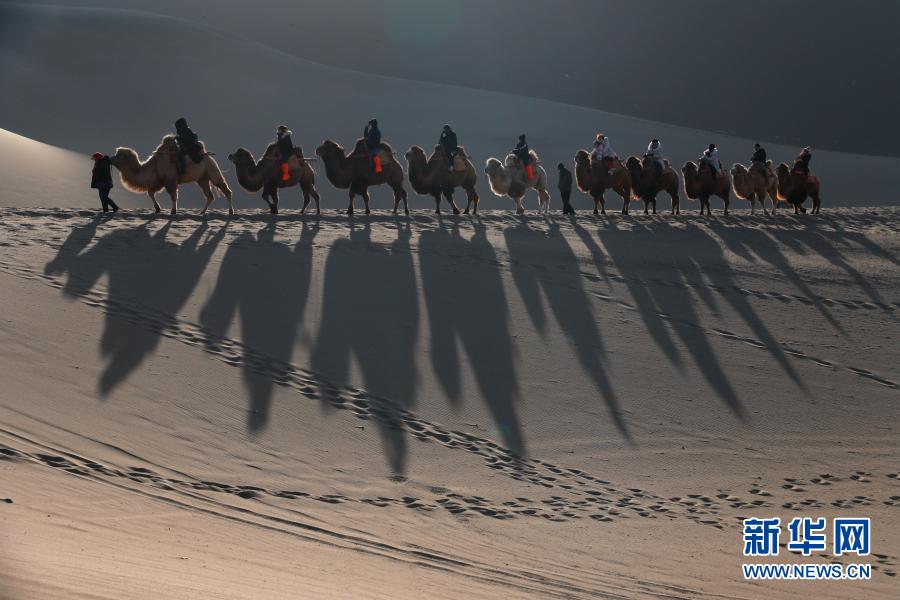 1月2日,游客在甘肅省敦煌市鳴沙山月牙泉景區(qū)騎駱駝游覽。