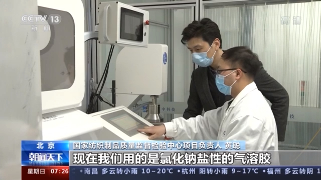 國家紡織制品質(zhì)量監(jiān)督檢驗(yàn)中心項(xiàng)目負(fù)責(zé)人 黃聰:現(xiàn)在我們用的是氯化鈉鹽性的一個氣溶膠,然后來測試,然后這個測試的氣溶膠粒徑,是0.075微米的一個粒徑,它是模擬日常的空氣當(dāng)中的這個顆粒物的一個粒徑的大小來測試的。