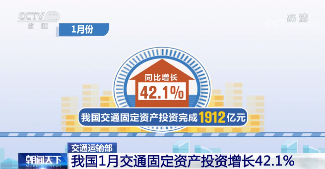 交通運(yùn)輸部數(shù)據(jù)顯示,1月份,我國(guó)交通固定資產(chǎn)投資完成1912億元,同比增長(zhǎng)42.1%。其中,公路水路完成投資1434億元,同比增長(zhǎng)52.3%。
