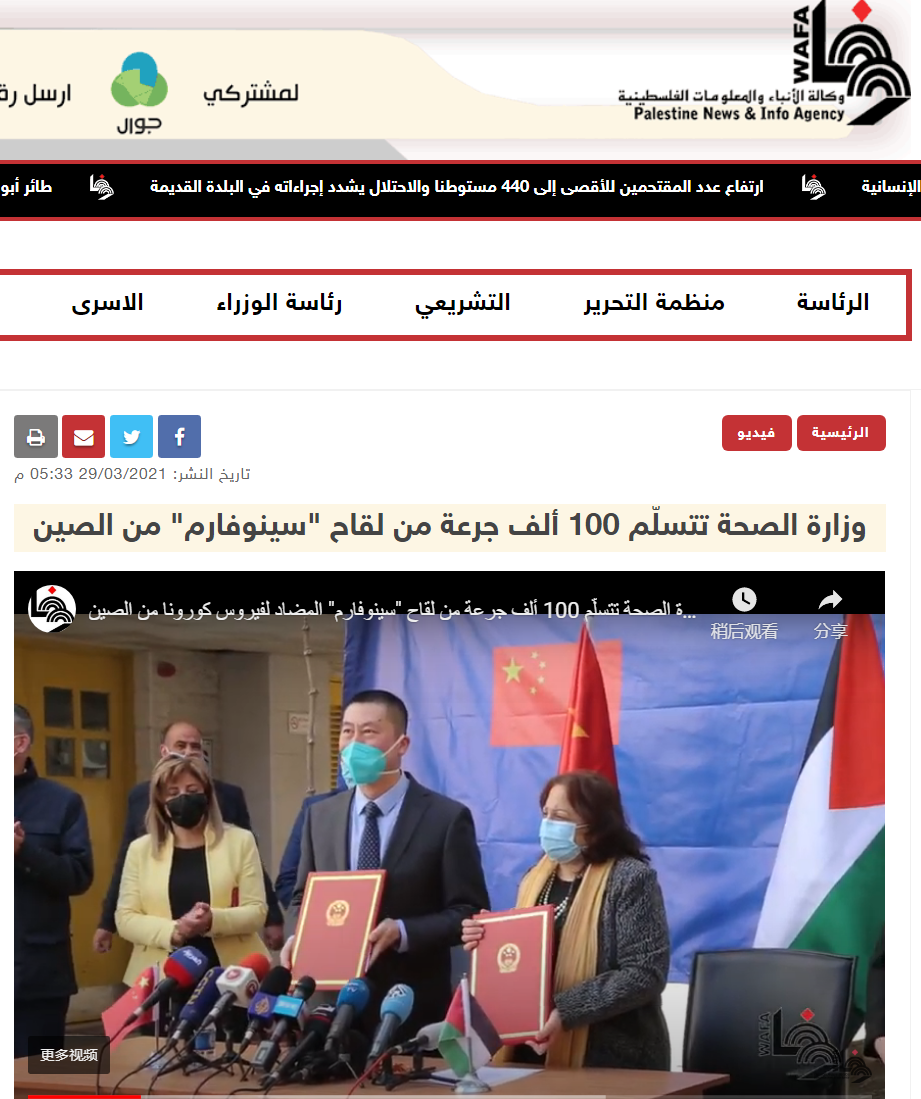 海外網(wǎng)3月30日電 據(jù)中國(guó)駐巴勒斯坦辦事處網(wǎng)站消息,3月29日,中國(guó)政府援助巴勒斯坦國(guó)藥新冠疫苗運(yùn)抵拉馬拉。駐巴勒斯坦辦事處主任郭偉、巴衛(wèi)生部長(zhǎng)凱萊共同出席在巴衛(wèi)生部舉行的疫苗交接儀式。