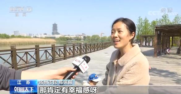 江蘇揚州市民 陳佩佩:那肯定有幸福感呀,出門就可以逛公園,對不對。風景比較好,然后設施也比較完善,管理的人也比較多,所以這些風景都維持得比較好一點。