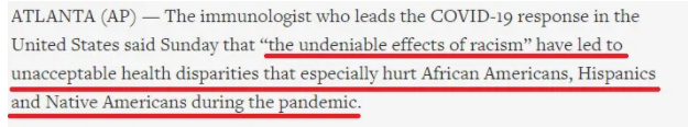 福奇:“疫情暴露了我們社會的失敗之處,所有與健康相關的決定性社會因素都與少數族裔面臨的不利條件相關聯。一些少數族裔民眾發(fā)現,他們從出生起,就在獲得充足食物、醫(yī)療保健方面處于不利地位,而這些因素與我們社會中不可否認的種族主義影響密切相關!
