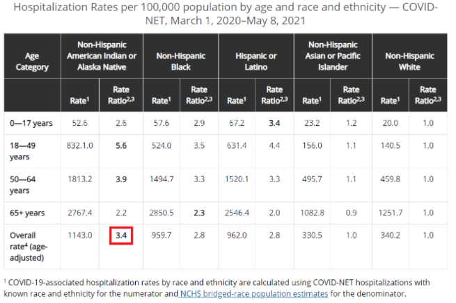 △CDC對2020年3月1日-2021年5月8日每10萬人住院率按年齡、種族的分列對比顯示,美國原住民的新冠肺炎住院率最高,是白人的3.4倍。