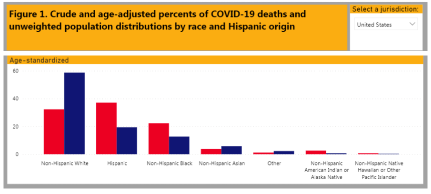△CDC調查顯示,拉丁裔、非洲裔和原住民死于新冠肺炎的比例(紅柱)遠高于這些族群在美國總人口中所占比例(藍柱)。