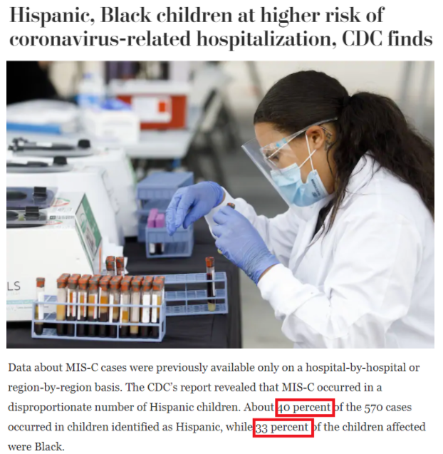 此外,新冠肺炎導致的嚴重并發(fā)癥也更常見于少數族裔兒童,超過70%的兒童多系統(tǒng)炎癥綜合征(MIS-C)報告病例發(fā)生在拉丁裔和非洲裔兒童中。