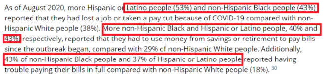 調查顯示,截至去年8月美國第二波疫情全面暴發(fā),失業(yè)或被減薪的非洲裔和拉丁裔美國人分別占到本族群的43%和53%;被迫動用儲蓄或退休金維持生計的非洲裔和拉丁裔美國人分別占40%和43%;在全額支付賬單時遇到困難的非洲裔和拉丁裔美國人分別占43%和37%。所有這些比例均明顯高于白人。