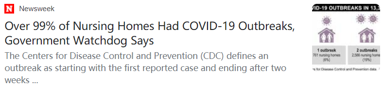 據美國《新聞周刊》報道,美國國會下屬審計機構“美國政府問責局”在梳理了13380家醫(yī)療保險和醫(yī)療補助認證的養(yǎng)老院的相關數據后發(fā)現,僅0.5%的養(yǎng)老院報告“未發(fā)生過新冠疫情”,約94%的養(yǎng)老院發(fā)生過一次以上疫情,44%的養(yǎng)老院發(fā)生過四次以上疫情。