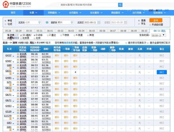 6月11日當(dāng)天,北京至鄭州方向高鐵列車車票銷售情況(12306官網(wǎng)截圖)