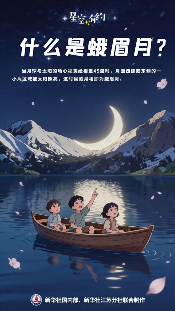 什么是蛾眉月?中國科學(xué)院紫金山天文臺科普主管王科超介紹,人們在地球上看到的月亮“相貌”隨著日、地、月相對位置變化而改變。當(dāng)月球與太陽的地心視黃經(jīng)相差約45度時,月面西側(cè)或東側(cè)的一小片區(qū)域被太陽照亮,這時候的月相即為蛾眉月。蛾眉月呈現(xiàn)類似柳葉的纖細(xì)形狀。