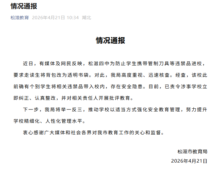 4月21日,湖北荊州松滋市教育局發(fā)布情況通報。