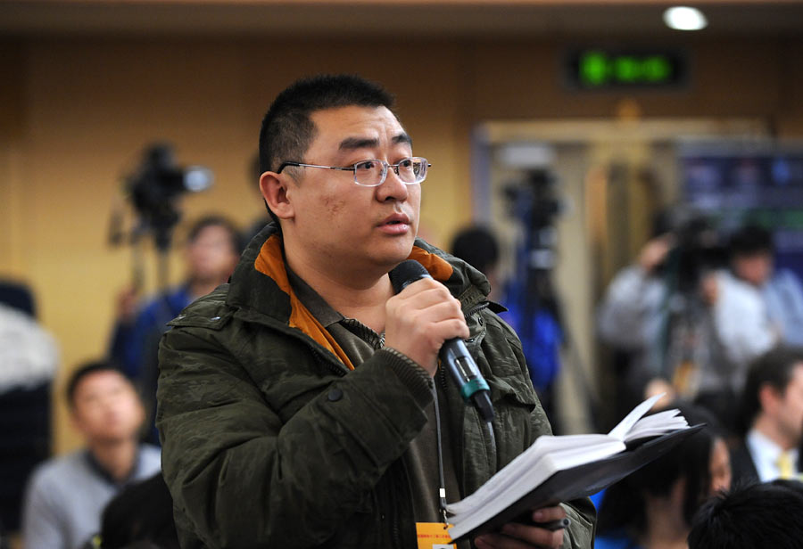 2014年3月6日上午9時(shí),十二屆全國人大二次會(huì)議新聞中心在梅地亞中心多功能廳舉行記者會(huì),邀請(qǐng)財(cái)政部部長樓繼偉、副部長張少春就“財(cái)稅體制改革和財(cái)政工作”的相關(guān)問題回答中外記者的提問。圖為山東商報(bào)記者提問。新華網(wǎng)/中國政府網(wǎng) 翟子赫攝