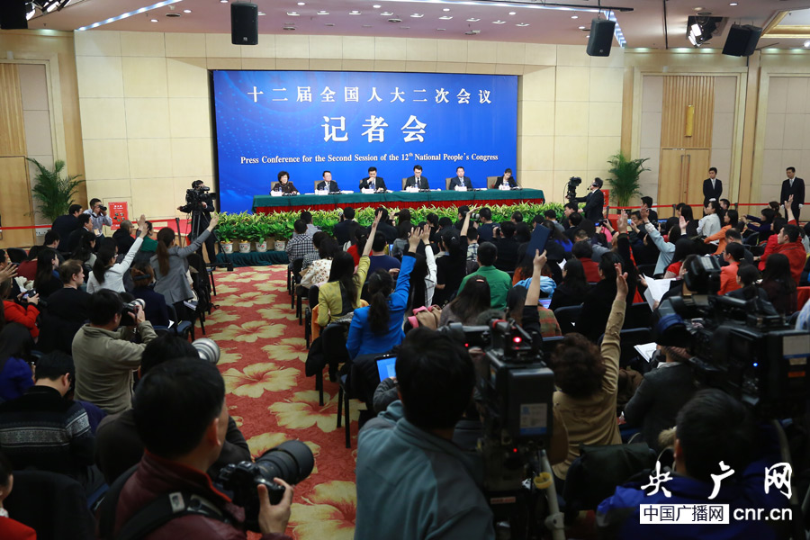十二屆全國人大二次會議新聞中心于3月8日(星期六)15時在梅地亞中心多功能廳舉行記者會,邀請環(huán)境保護部副部長吳曉青、污染防治司司長趙英民、環(huán)境監(jiān)測司司長羅毅、污染物排放總量控制司司長劉炳江就“加強環(huán)境保護建設(shè)美麗中國”的相關(guān)問題回答中外記者的提問(央廣網(wǎng)記者涂傲)