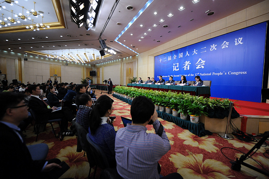 3月9日15時,十二屆全國人大二次會議新聞中心在梅地亞中心多功能廳舉行記者會,全國人大五位負責(zé)人將就“人大立法和監(jiān)督工作”相關(guān)問題回答中外記者提問。圖為記者會現(xiàn)場。陳競超 攝