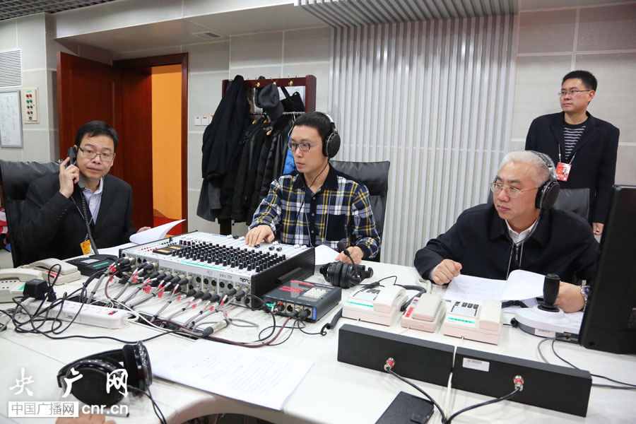 中央人民廣播電臺總工程師錢岳林、副總編輯劉曉龍現(xiàn)場指揮直播工作(央廣網(wǎng)記者涂傲攝)