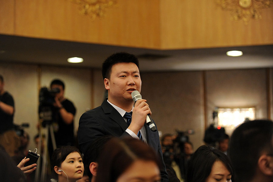 3月4日,十二屆全國人大二次會議新聞發(fā)布會在人民大會堂一層新聞發(fā)布廳召開,大會新聞發(fā)言人向中外媒體介紹本次大會有關情況,并回答記者提問。圖為中新社記者提問。新華網/中國政府網 陳競超 攝