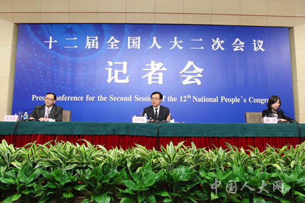 3月7日上午,十二屆全國(guó)人大二次會(huì)議在梅地亞中心舉行記者會(huì),商務(wù)部部長(zhǎng)高虎城就“商務(wù)發(fā)展與對(duì)外開(kāi)放”的相關(guān)問(wèn)題回答中外記者的提問(wèn)。圖為主席臺(tái)全景。羅榮 攝