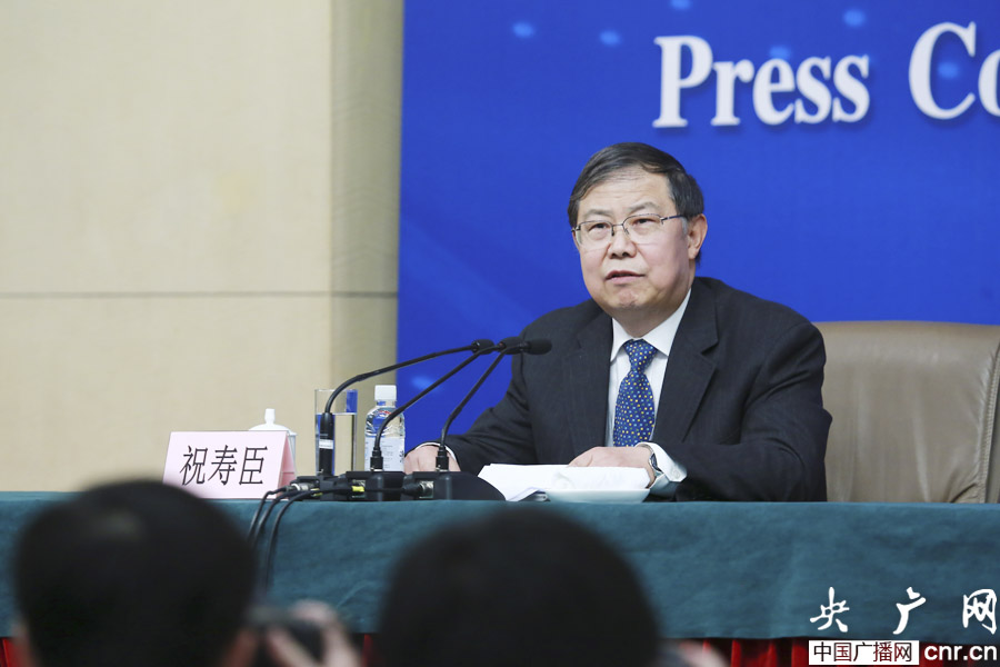 十二屆全國人大二次會議新聞中心副主任祝壽臣主持記者會(央廣網記者 涂傲 攝)