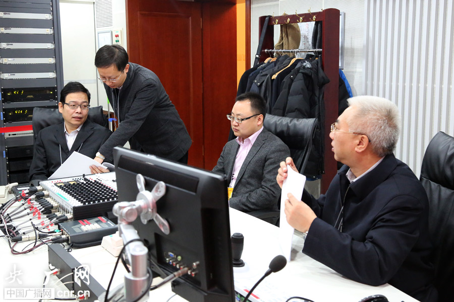 中央人民廣播電臺總工程師錢岳林、副總編輯劉曉龍現(xiàn)場指揮中央臺全國政協(xié)十二屆二次會議閉幕會直播工作