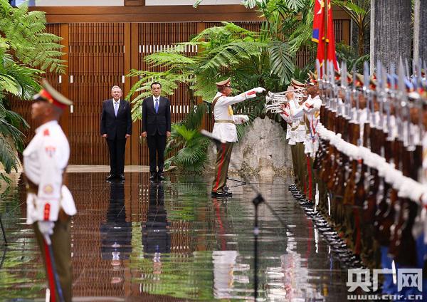 當(dāng)?shù)貢r(shí)間24日,勞爾·卡斯特羅在哈瓦那革命宮主持儀式,歡迎李克強(qiáng)總理正式訪問