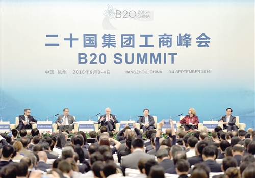 9月4日,澳大利亞總理特恩布爾(左三)在研討會上發(fā)言。當(dāng)日,二十國集團(tuán)工商峰會在浙江杭州舉辦“實(shí)現(xiàn)強(qiáng)勁的國際貿(mào)易和投資”專題研討。 新華社記者 李 鑫攝