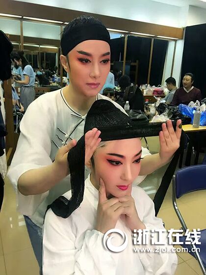 排演時化妝間里的茅威濤(上)和謝群英(下)