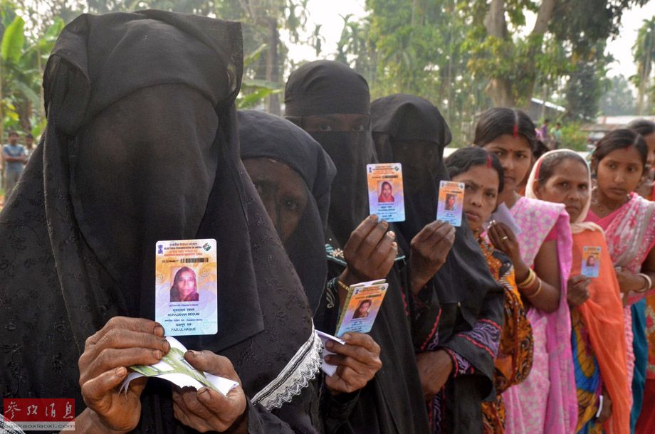 4月7日,在印度東北部阿薩姆邦的納果阿地區(qū),排隊(duì)等候投票的選民展示她們的身份證件。印度大選當(dāng)日開始,將持續(xù)5個星期,分9個階段舉行,結(jié)果預(yù)計(jì)5月中旬揭曉。印度是聯(lián)邦制國家,議會實(shí)行兩院制,分為聯(lián)邦院(議會上院)和人民院(議會下院),大選指的是人民院選舉。印度人民院選舉每5年舉行一次,在人民院選舉中贏得多數(shù)的政黨或政黨聯(lián)盟有權(quán)組建內(nèi)閣。在本次議會選舉中,印度合法選民總計(jì)8.14億,比2009年的上一次議會選舉增加超過1億。新華社/法新