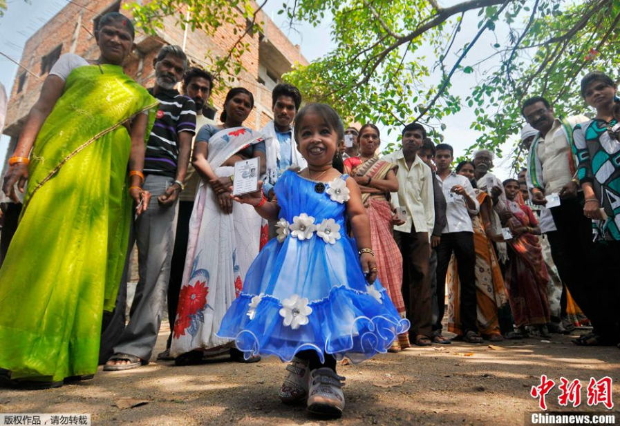 4月10日,印度那格浦爾(Nagpur),20歲的世界最矮女性Jyoti Amge參與印度大選投票,圖為Jyoti Amge在投票點(diǎn)展示自己的選票。Jyoti Amge被吉尼斯世界紀(jì)錄認(rèn)證為世界最矮女性。4月10日,長(zhǎng)達(dá)一個(gè)多月的印度大選進(jìn)入第三階段,首都新德里等14個(gè)地區(qū)開始投票,約1億選民將選出印度人民院中的91個(gè)席位。