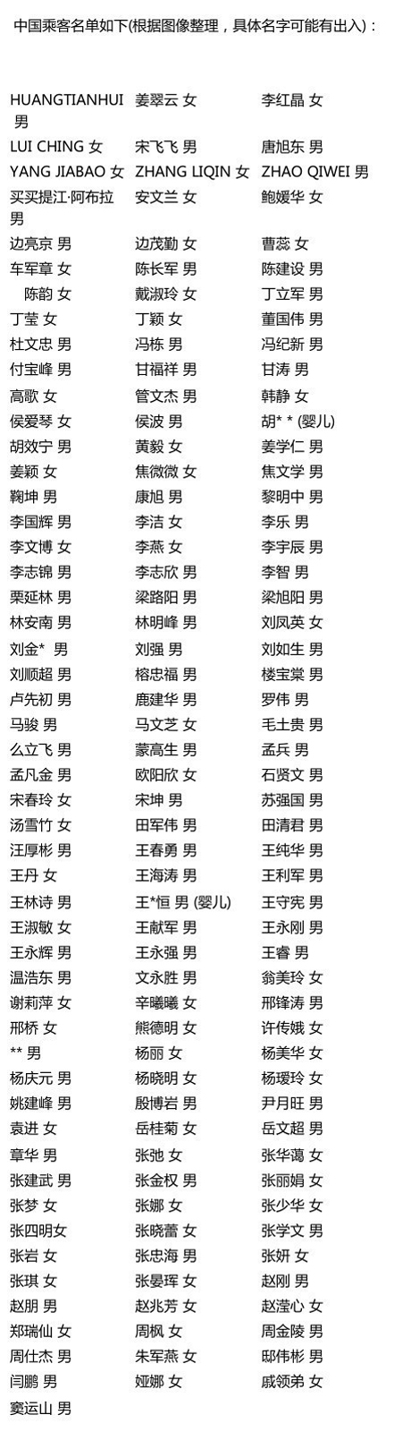 中國乘客:154人(包括1名嬰兒和1位來自臺灣地區(qū)的乘客)