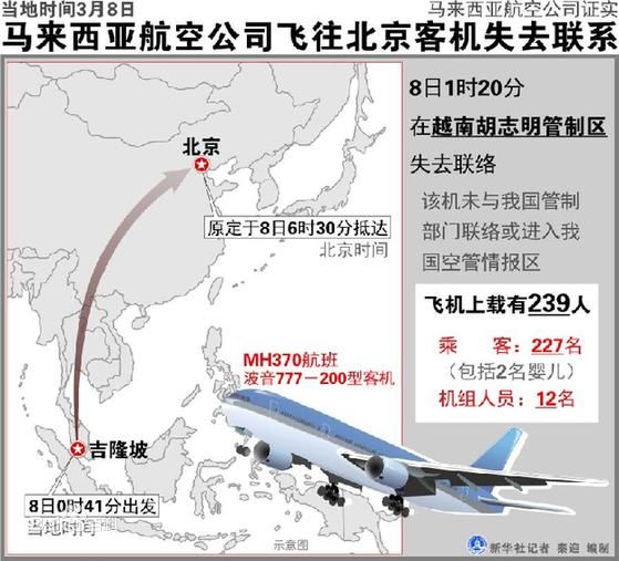據(jù)外媒報(bào)道,馬來西亞航空稱一架由吉隆坡飛往北京的航班失去聯(lián)系,該飛機(jī)上載有239人,馬航提供數(shù)字稱機(jī)上有158名中國人。目前,這些乘客的情況暫不明朗。
