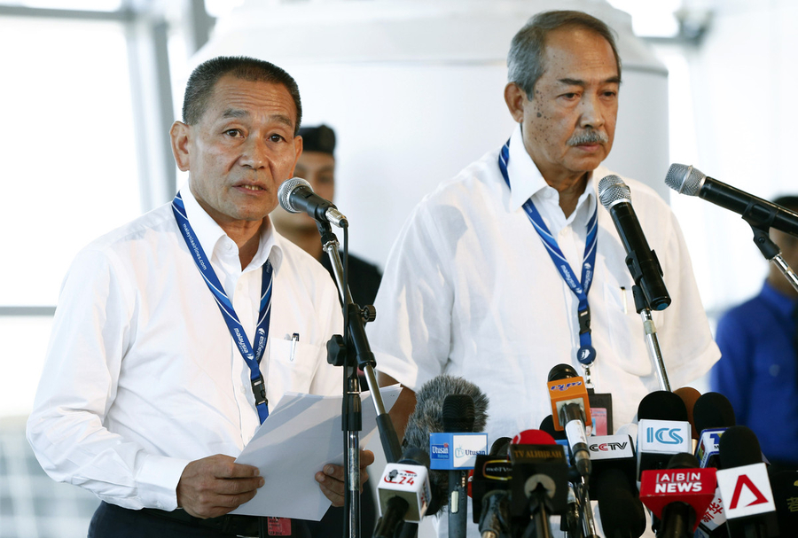 當?shù)貢r間2014年3月25日,馬來西亞雪邦,馬來西亞航空集團公司首席執(zhí)行官Ahmad Jauhari Yahya(左)與馬航主席于瑟夫召開新聞發(fā)布會。中方要求馬方移交關于失蹤航班的所有相關衛(wèi)星數(shù)據(jù)分析。