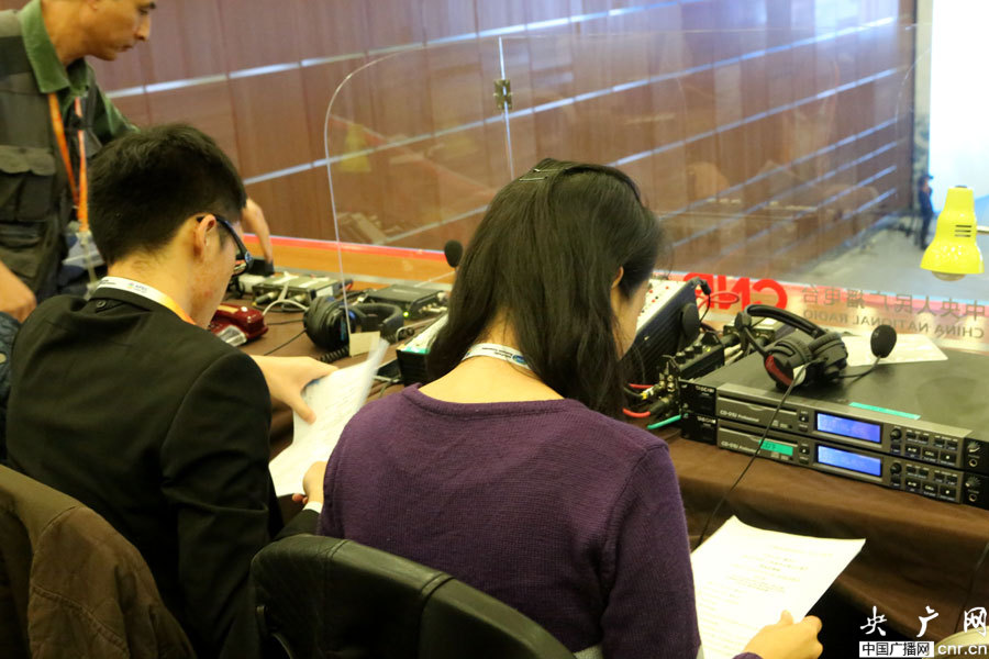 主持人胡凡(左)劉倩(右)在做直播前準備(央廣網(wǎng)記者李江雪 攝)