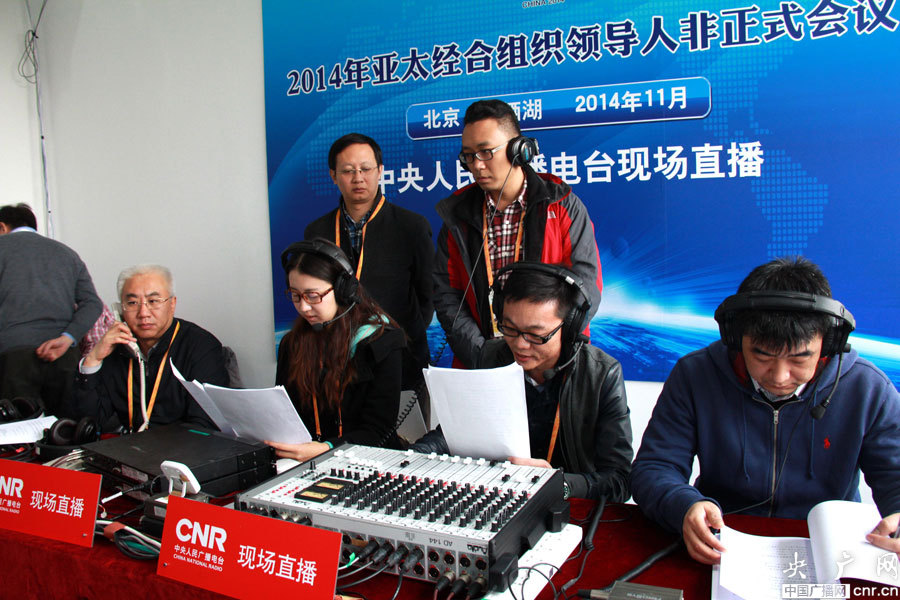 劉曉龍副總編和總編室副主任胡國華與APEC報道人員在做直播前準(zhǔn)備
