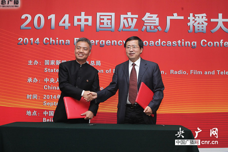 圖為中央人民廣播電臺與國家海洋環(huán)境預報中心合作協(xié)議的簽約儀式,人中央人民廣播電臺副臺長王曉暉(左)、國家海洋環(huán)境預報中心主任王輝(右)進行簽約。(央廣網記者杜虎_攝)