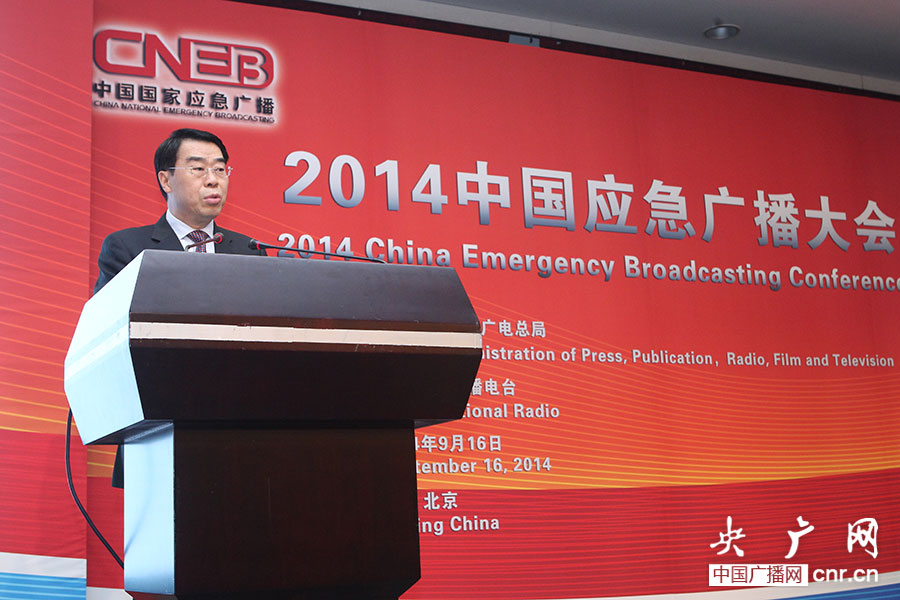 16日,由國家新聞出版廣電總局主辦、中央人民廣播電臺承辦的首屆國家應(yīng)急廣播大會——“2014中國應(yīng)急廣播大會”在京召開。大會為期一天,主題涵蓋:應(yīng)急廣播與應(yīng)急管理、應(yīng)急廣播案例分享、應(yīng)急廣播與新媒體、面向未來的應(yīng)急廣播等內(nèi)容。圖為中央人民廣播電臺臺長王求為大會致辭。(央廣網(wǎng)記者杜虎_攝)