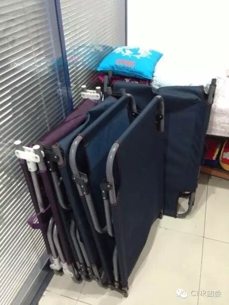 四樓大平臺一個(gè)十分隱蔽的小房間,四五張折疊床靠在角落。白天它們并不起眼,可到了夜晚,輪到他們大顯身手了。夜已深,一人拖著一張床,去哪兒睡?那就自己找吧。某中心領(lǐng)導(dǎo)辦公室,夜晚被我們成功占領(lǐng),有些房間雖然只夠得上放一張床,也沒有被我們放棄。還有的同學(xué),直接在平臺的大空地,擺上一張床。因?yàn)閷挸,也為了盯著隨時(shí)會(huì)響的電話。