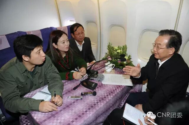 時任國務院總理溫家寶在出訪的專機上接受記者采訪