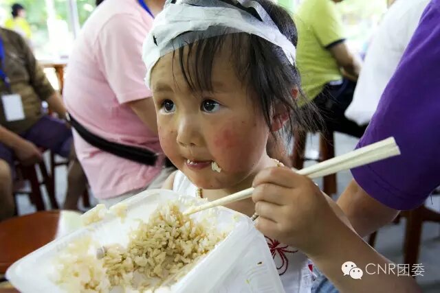 拍照時,鏡頭里出現(xiàn)了一位3歲左右的小女孩,白色連衣裙,上面點綴著蝴蝶花紋,肉嘟嘟的小臉,圓圓的大眼睛。然而此時,小姑娘頭上包扎著紗布,正端著一個飯盒用筷子大口大口扒著飯,本應(yīng)透著天真、童趣的眼睛里滿是驚恐和不安。按下快門的時候,我已忍不住熱淚盈眶。本想上前采訪幾句,最后還是忍住了,只是遠遠地拍下幾張圖片,送去默默的祝福。