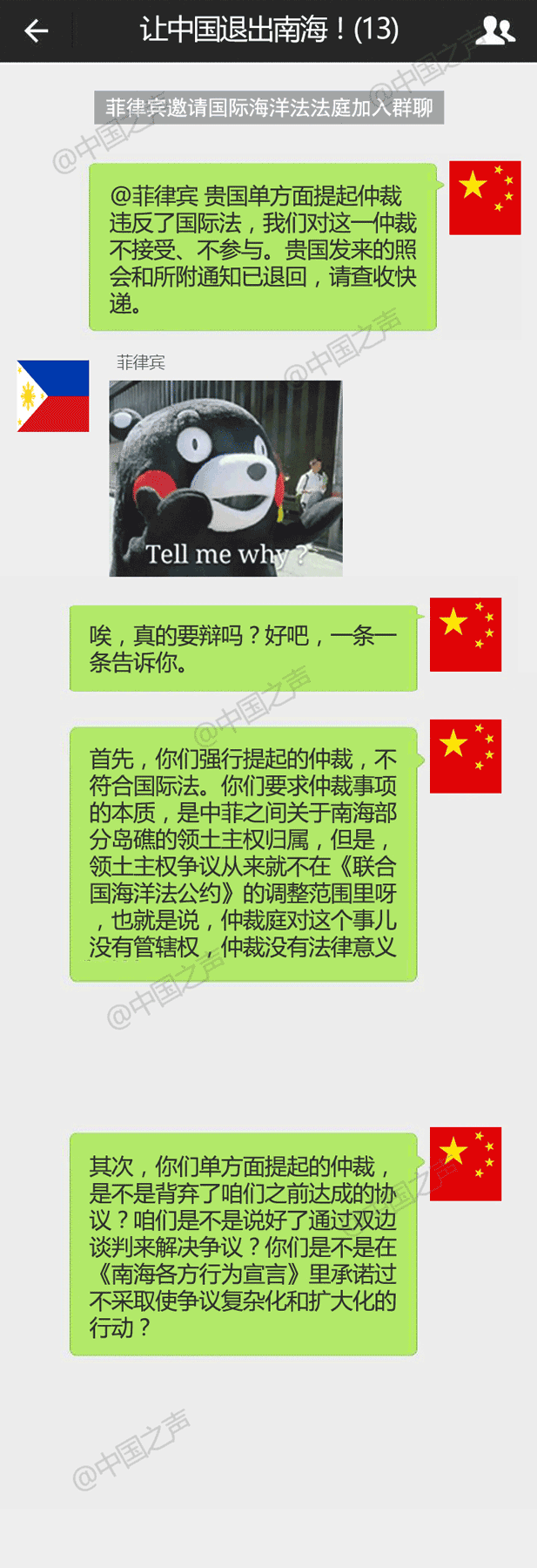 比如我們最早開始做的用微信群、朋友圈形式說新聞,不斷有人問,你們用什么軟件生成的圖?答案是并沒有!是夏文一點(diǎn)一點(diǎn)生生用PS做出的圖,而且包括群聊人數(shù)的變化、表情的呈現(xiàn)、發(fā)言方的位置等等每一個微小的細(xì)節(jié)都考慮到了!后來每一次出新作品,他還都會加進(jìn)一點(diǎn)不一樣的元素,最近一次說南海仲裁,我說我想要個菲律賓面對各國質(zhì)疑時心虛飄走的狀態(tài),夏文愣是想法做了個“彈幕”效果進(jìn)去!