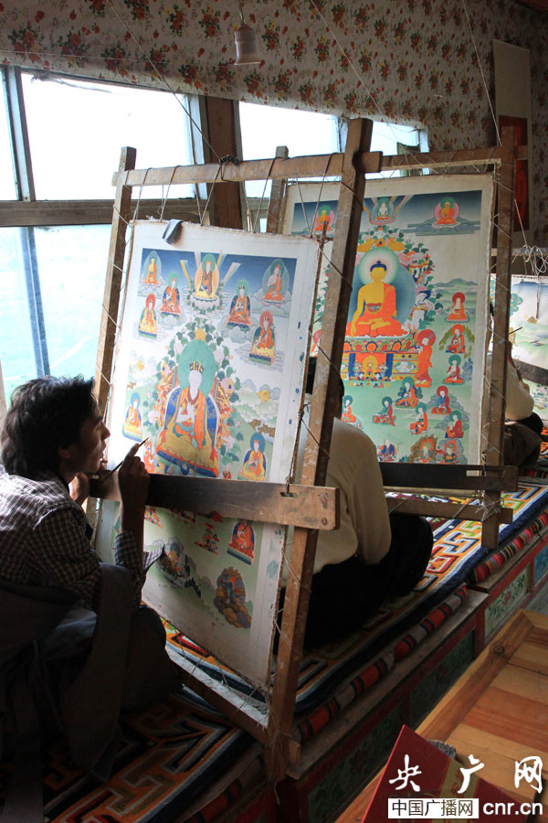 嘎瑪民族手工藝由匠人代代相傳,較少文字資料記載,但其名聲歷來在康巴地區(qū)有較大影響。其中唐卡畫的歷史可追溯到吐蕃時期,距今有7百多年的歷史。其畫以長期發(fā)展起來的壁畫藝術(shù)為基礎(chǔ),逐步演繹出一種獨特、別具一格、易于收藏、利于宣傳宗教的一種新型畫種---唐卡。嘎瑪鄉(xiāng)唐卡屬“嘎瑪噶志”畫派,相傳由郎卡扎西活佛所創(chuàng),與其同時期的八世噶瑪巴活佛米久多吉,奠定了“嘎瑪噶志畫派” 的造型理論基礎(chǔ)。16世紀,嘎瑪噶志畫派開始盛行康區(qū),先后涌現(xiàn)出了一批大師。嘎瑪噶志畫派在發(fā)展過程中,由于生存地域與中原漢地緊密相連,在政治、經(jīng)濟、文化上的交往也相對頻繁,尤其在繪畫方面,多受漢地明代以后工筆重彩畫和四川綿竹木版年畫的影響。其總體風(fēng)格形成了有別于衛(wèi)藏地區(qū)勉唐、欽則兩大畫派的獨特面貌,佛像造型多南亞梵式風(fēng)格,畫面主體人物的色彩、技法為本土格調(diào),背景山水風(fēng)景、花卉草木又多漢式趣味的新畫風(fēng)。20世紀初,噶志派藝術(shù)達到了更為完善和成熟的境界。