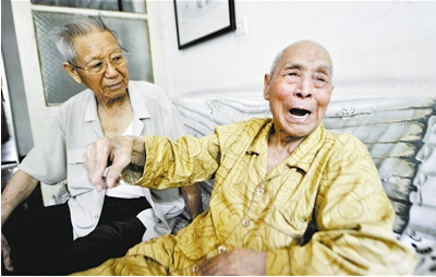。冈拢保等,在紀(jì)念抗戰(zhàn)勝利69周年的日子,86 歲的老兵袁永福與96歲的老兵郭鴻聲再度相聚。雖然時光已經(jīng)遠去,但是那段歲月對這兩位老者來說,猶如昨天一樣歷歷在目。