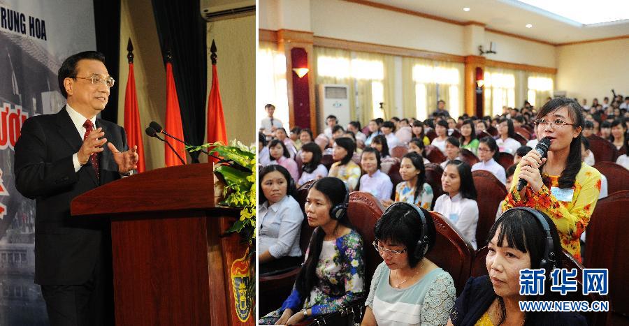 10月15日,國(guó)務(wù)院總理李克強(qiáng)來到越南河內(nèi)國(guó)家大學(xué),同中越兩國(guó)青年見面交流。這是李克強(qiáng)現(xiàn)場(chǎng)回答一位越南女青年的提問。 新華社記者劉建生 攝