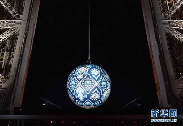 11月23日,在法國巴黎,一個名為“地球危機”的大圓球懸掛在埃菲爾鐵塔上。