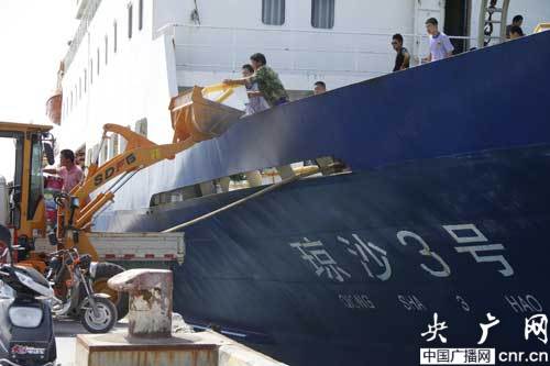 瓊沙3號(hào)抵達(dá)永興島的時(shí)間一般都是中午,雖然這里的陽(yáng)光熾熱而濃烈,但瓊沙3號(hào)一靠岸,永興島的碼頭上就立刻聚滿了接收物資的人和車(chē)輛。島上的人互相微笑頷首,基本都相熟。