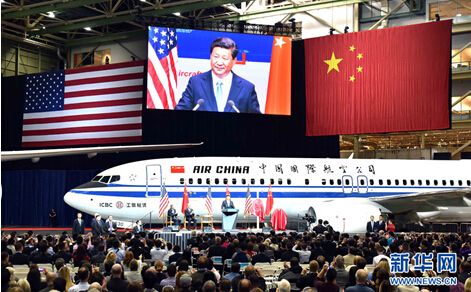 9月23日,國家主席習(xí)近平在西雅圖參觀波音公司商用飛機(jī)制造廠。這是習(xí)近平在波音公司舉行的歡迎儀式上致辭。 新華社記者李濤攝
