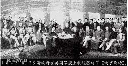 1842年,清朝在與英國的第一次鴉片戰(zhàn)爭中戰(zhàn)敗。清政府代表在泊于南京(時稱江寧)下關(guān)江面的英軍旗艦康華麗號上與英國簽署《中英南京條約》。這是中國近代史上與外國簽訂的第一個喪權(quán)辱國的不平等條約。