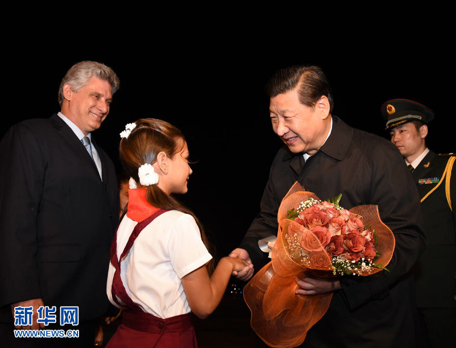 當地時間21日晚9時許,習近平乘坐的專機抵達哈瓦那何塞·馬蒂國際機場。習近平受到古巴國務委員會第一副主席兼部長會議第一副主席迪亞斯-卡內爾熱情迎接。古巴少年向習近平獻花。