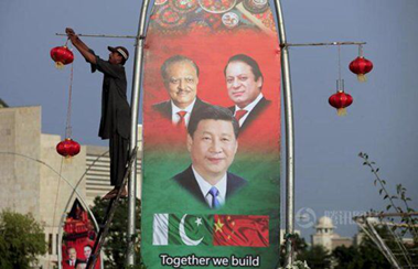 2015年4月19日,巴基斯坦首都伊斯蘭堡,工人懸掛大紅燈籠和印有巴勒斯坦總統(tǒng)侯賽因、總理謝里夫、中國(guó)國(guó)家主席習(xí)近平的畫(huà)像,歡迎習(xí)近平訪(fǎng)問(wèn)巴基斯坦。