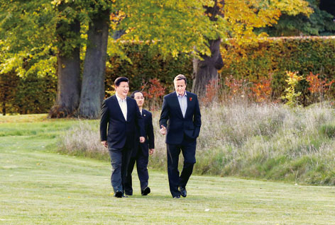 10月22日,國(guó)家主席習(xí)近平在契克斯首相鄉(xiāng)間別墅同英國(guó)首相卡梅倫再次會(huì)晤。這是習(xí)近平與卡梅倫漫步草坪,邊走邊談。