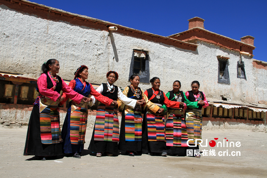 在卓嘎當(dāng)年被迫為達(dá)官顯貴們跳舞的托林寺,她的徒弟們手挽手為賓客們送上來自遠(yuǎn)古的舞姿與歌聲。攝影:廖繼勇
